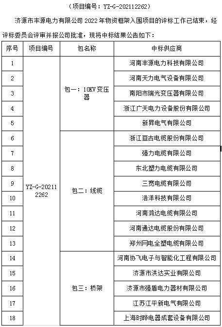 米兰MiLan(中国)市丰源电力有限公司2022年物资框架入围项目中标结果公告