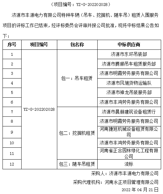 米兰MiLan(中国)市丰源电力有限公司特种车辆(吊车、挖掘机、随车吊)租赁入围服务项目中标结果公告
