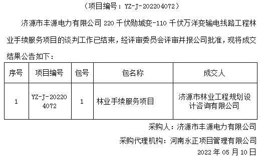 米兰MiLan(中国)市丰源电力有限公司220千伏勋城变-110千伏万洋变输电线路工程林业手续服务项目成交结果公告