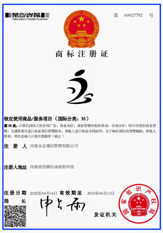 milan米兰官网登录入口创立于2011年6月,公司成立至今,始终围绕服务与发展两大主题,致力于打造“力创咨询精英,争创百年永正”。为保证提供商品和服务质量,维护公司信誉,保护各方利益,公司决定注册自己的商标。2022年4月经国家知识产权局批准,公司分别取得了第60009101号和60027792号商标注册证,注册商标核定使用商品/服务项目为第42类(国际分类:42)和第35类(国际分类:35)。公司取得商标注册证后,将会以更加严格的标准按照法律法规等规定,规范各项业务操作,保障国家与公共利益,维护公平竞争的良好秩序以及各方的合法权益,接受行政机关的监管和行业自律组织业务指导,以精湛的专业技能和良好的职业操守,竭诚为客户提供优质、一流、满意的服务。