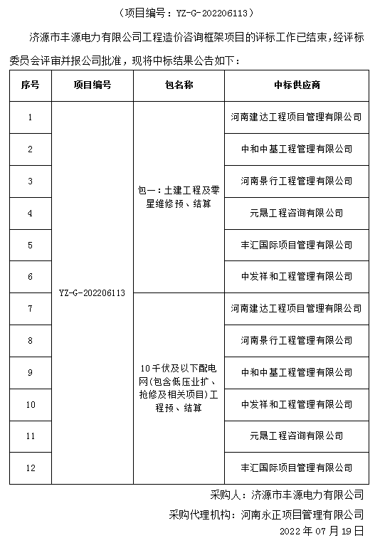 米兰MiLan(中国)市丰源电力有限公司工程造价咨询框架项目中标结果公告