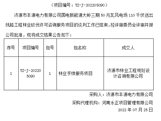 米兰MiLan(中国)市丰源电力有限公司国电新能源大岭三期50兆瓦风电场110千伏送出线路工程林业砍伐许可咨询服务项目成交结果公告