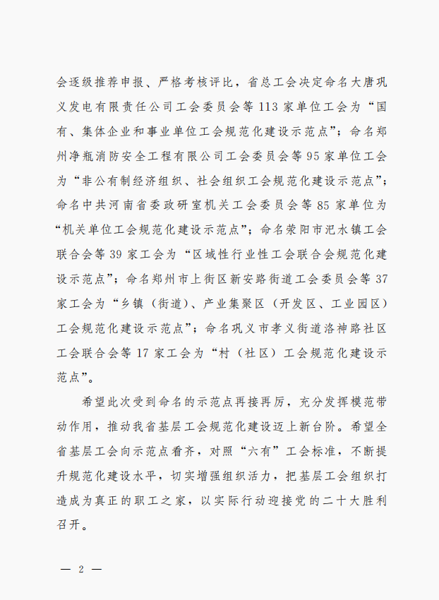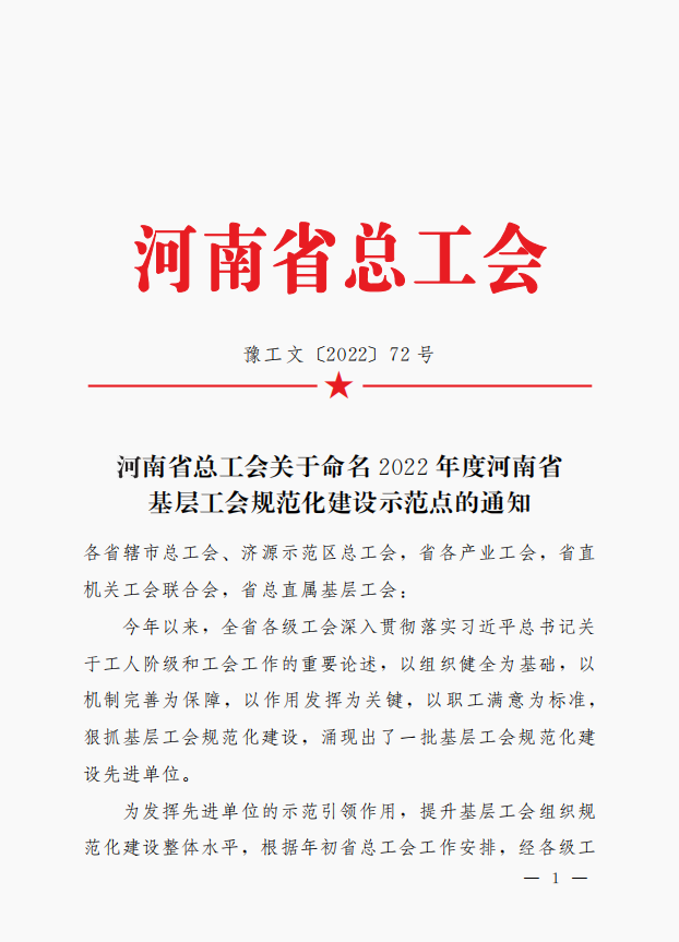 milan米兰官网登录入口工会委员会被河南省总工会命名为“2022年度河南省基层工会规范化建设示范点”