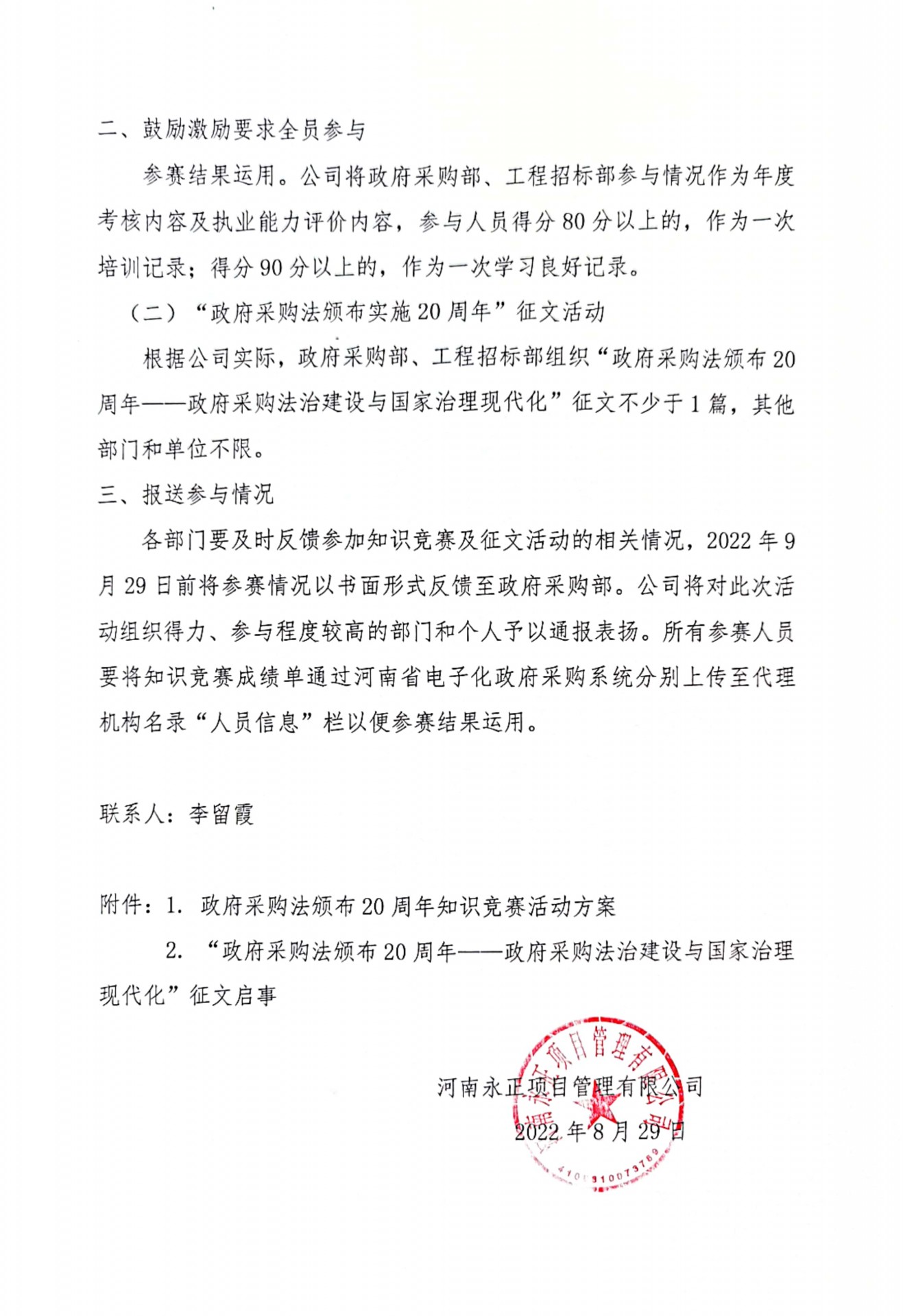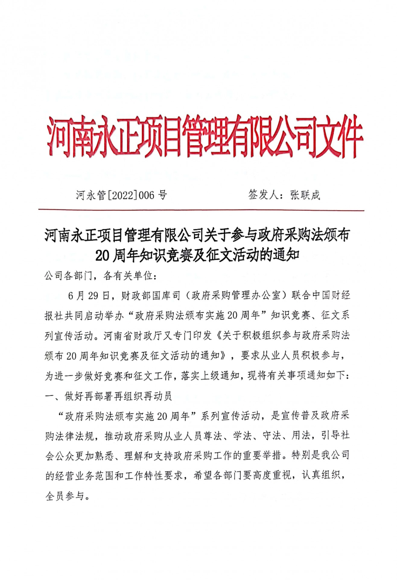 6月29日,财政部国库司(政府采购管理办公室)联合中国财经报社共同启动举办“政府采购法颁布实施20周年”知识竞赛、征文系列宣传活动以来,河南省财政厅又专门印发《关于积极组织参与政府采购法颁布20周年知识竞赛及征文活动的通知》,要求从业人员