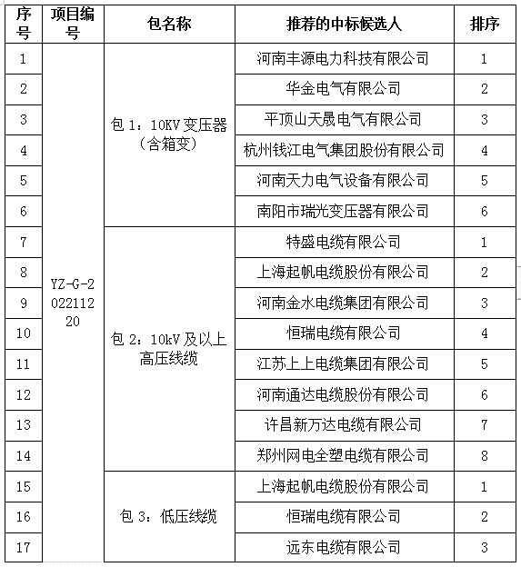 米兰MiLan(中国)市丰源电力有限公司2023年物资框架入围项目的评标工作已结束,依据《中标人民共和国招标投标法实施条例》、《招标公告和公示信息发布管理办法》和本项目招标文件对中标候选人公示的规定,现将评标委员会推荐的中标候选人予以公示,公示期3日。投标人或者其他利害关系人若对评标结果有异议的,请在中标候选人公示期间以书面形式提出。