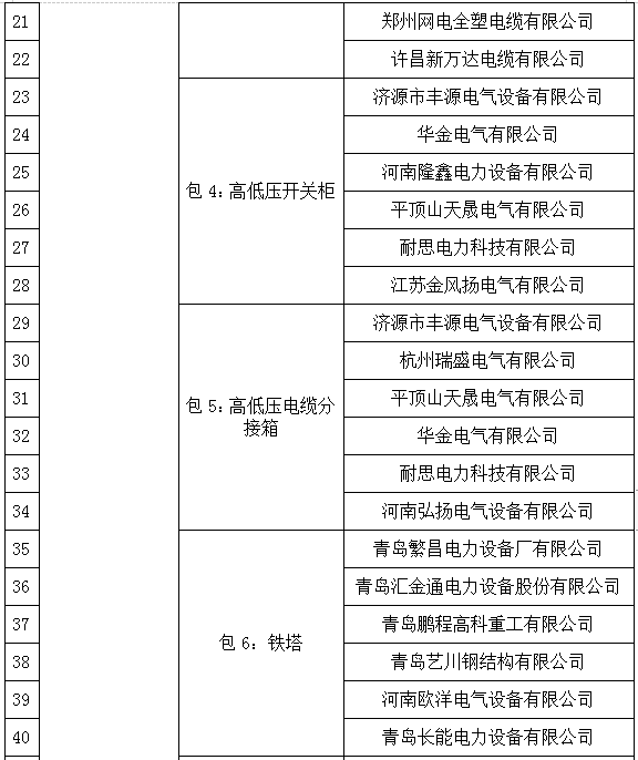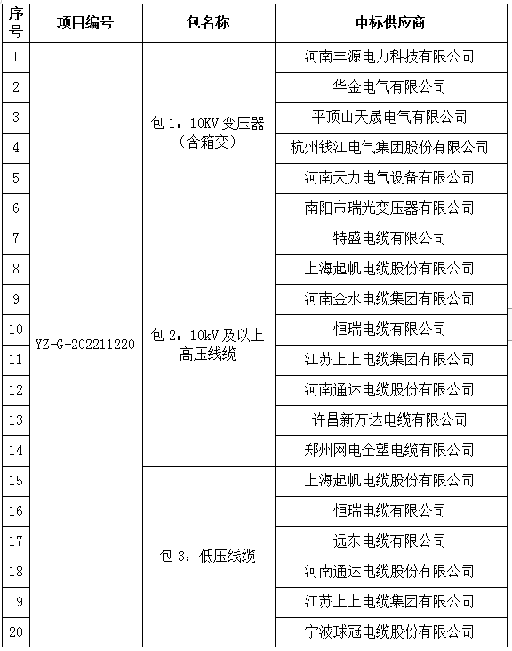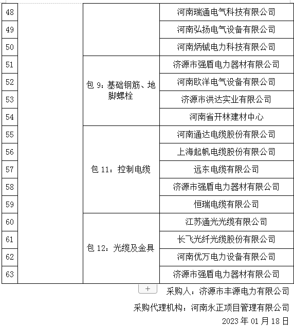 米兰MiLan(中国)市丰源电力有限公司2023年物资框架入围项目的评标工作已结束,经评标委员会评审并报公司批准,现将中标结果公告如下: