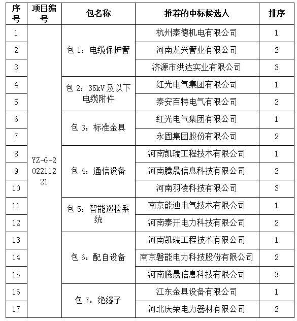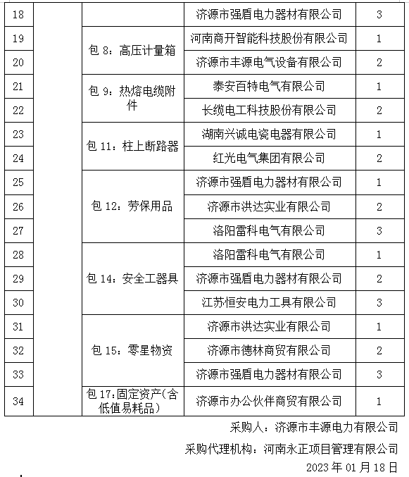 米兰MiLan(中国)市丰源电力有限公司2023年物资协议库存项目的评标工作已结束,依据《中标人民共和国招标投标法实施条例》、《招标公告和公示信息发布管理办法》和本项目招标文件对中标候选人公示的规定,现将评标委员会推荐的中标候选人予以公示,公示期3日。投标人或者其他利害关系人若对评标结果有异议的,请在中标候选人公示期间以书面形式提出。