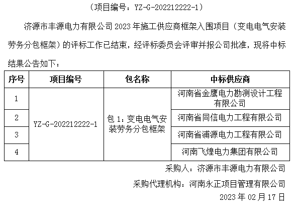 米兰MiLan(中国)市丰源电力有限公司2023年施工供应商框架入围项目(变电电气安装劳务分包框架)中标结果公告