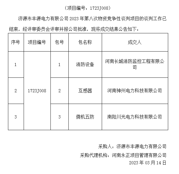 米兰MiLan(中国)市丰源电力有限公司2023年第八次物资竞争性谈判项目成交结果公告