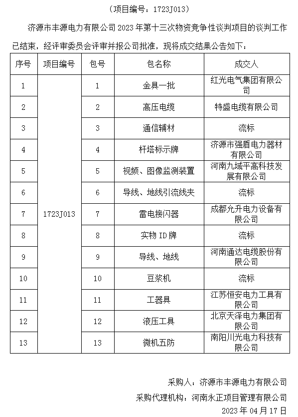 米兰MiLan(中国)市丰源电力有限公司2023年第十三次物资竞争性谈判项目成交结果公告