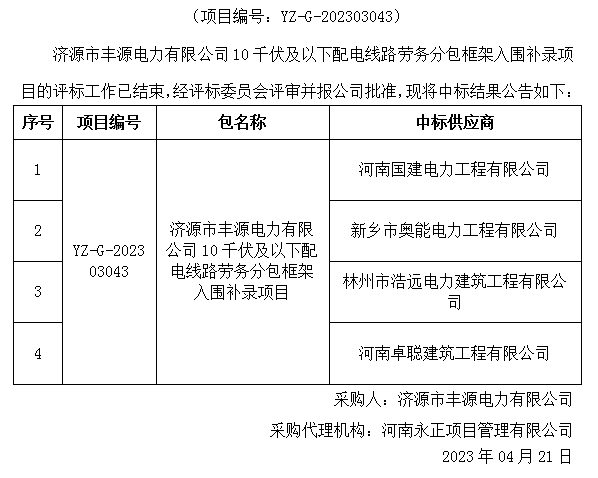 米兰MiLan(中国)市丰源电力有限公司10千伏及以下配电线路劳务分包框架入围补录项目中标结果公告