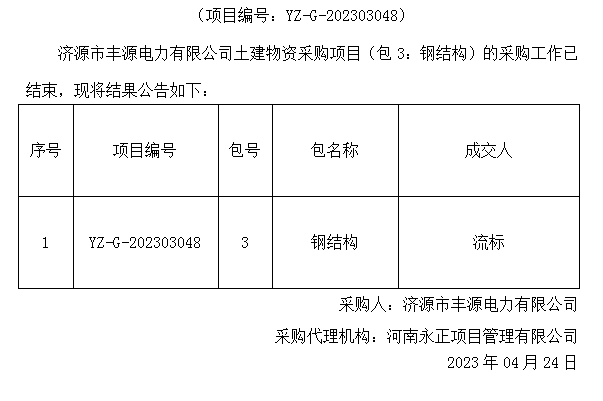 米兰MiLan(中国)市丰源电力有限公司土建物资采购项目(包3:钢结构)废标公告