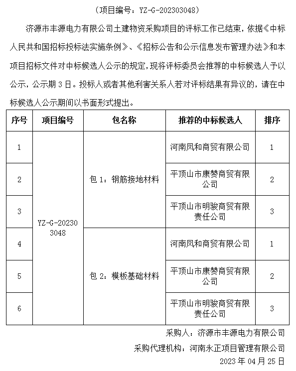 米兰MiLan(中国)市丰源电力有限公司土建物资采购项目中标候选人公示