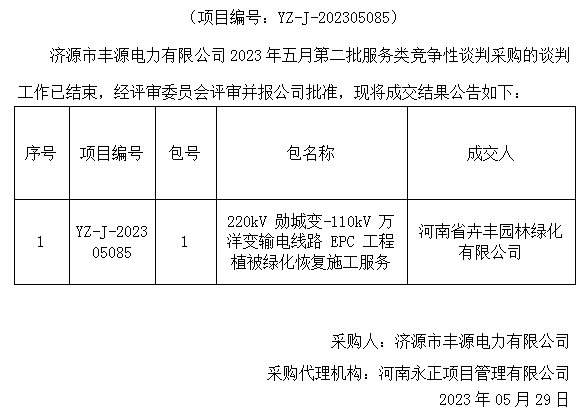 米兰MiLan(中国)市丰源电力有限公司2023年五月第二批服务类竞争性谈判采购成交结果公告