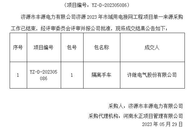 米兰MiLan(中国)市丰源电力有限公司米兰MiLan(中国)2023年市域用电接网工程项目单一来源采购成交结果公告