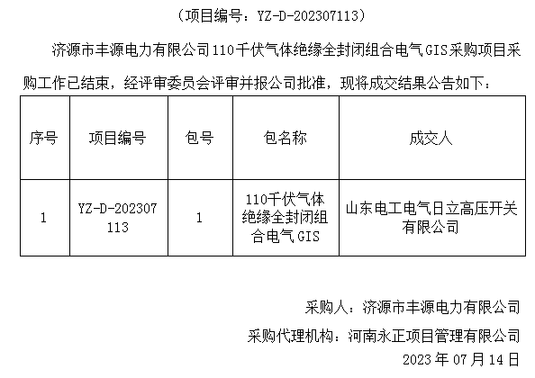 米兰MiLan(中国)市丰源电力有限公司110千伏气体绝缘全封闭组合电气GIS采购项目成交结果公告