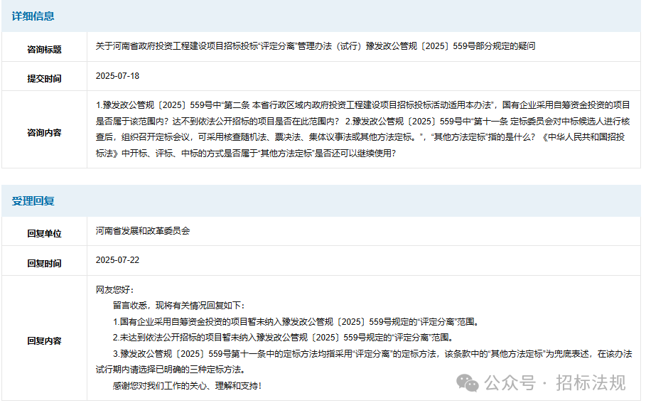 2.未达到依法公开招标的项目暂未纳入豫发改公管规〔2025〕559号规定的“评定分离”范围。